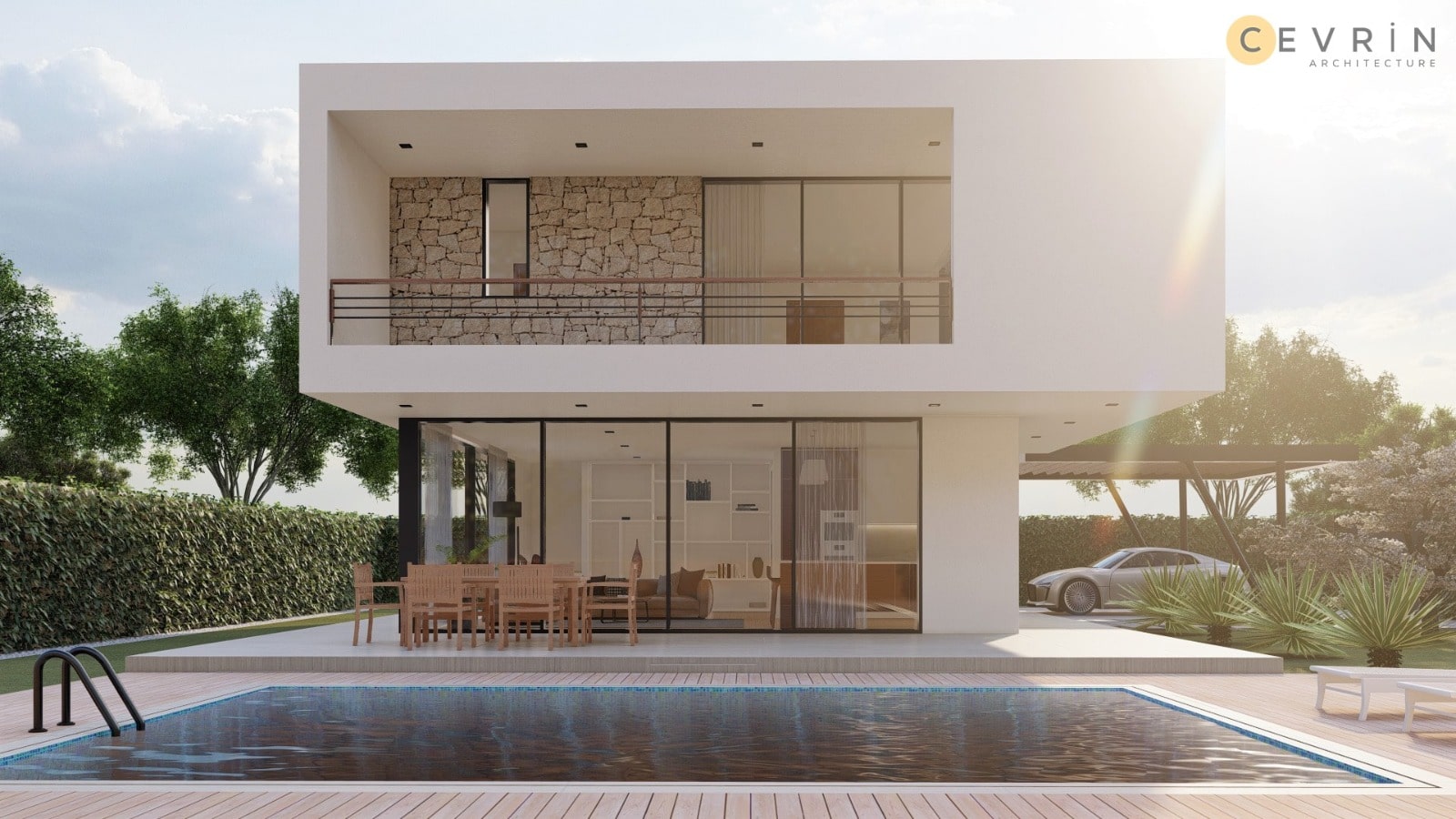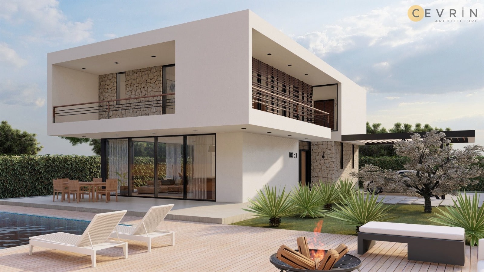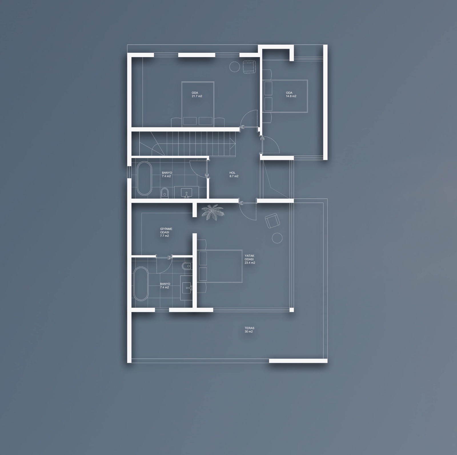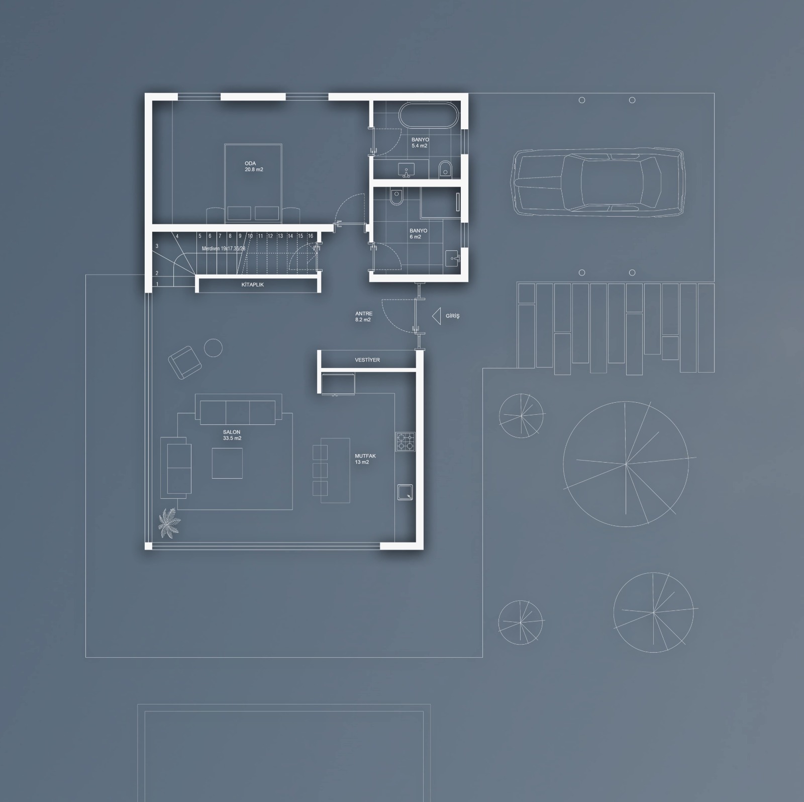 527 metrekarelik arsa üzerine tasarladığımız 4+1 havuzlu villanın toplam inşaat alanı 250 m2'dir. Zemin katı 105 m2 olup, 1. katı ise 145 m2 bir brüt alana sahiptir.